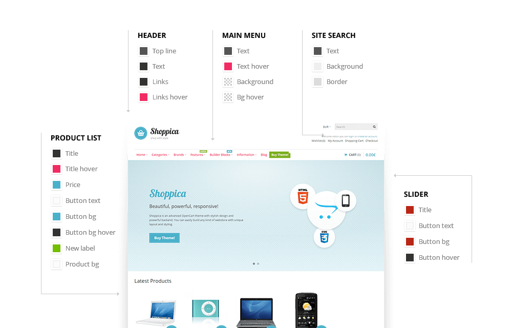 In order to reduce the setup times, Shoppica introduces the color inheritance. This unique feature allows the user to set only default theme colors and all other elements will get their color values automatically. The main(parent) colors are organized in a separate panel in the theme administration area for easier use. Of course, you can break the inheritance tree and fine-tune every single color to match your specific needs.