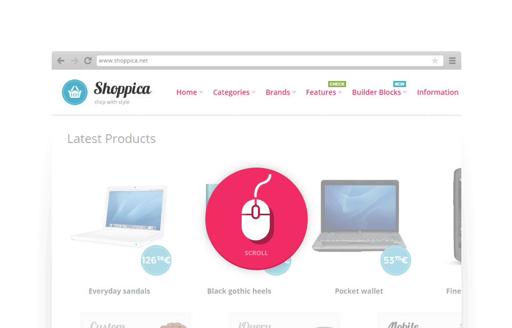 In most of the websites as soon we start scrolling down the page the header navigation is left out of the visible window area. The user must scroll back to the top of the website in order to access it. The Shoppica’s sticky header solves this annoying issue - it sticks at the top of the page and stands always at your disposal.